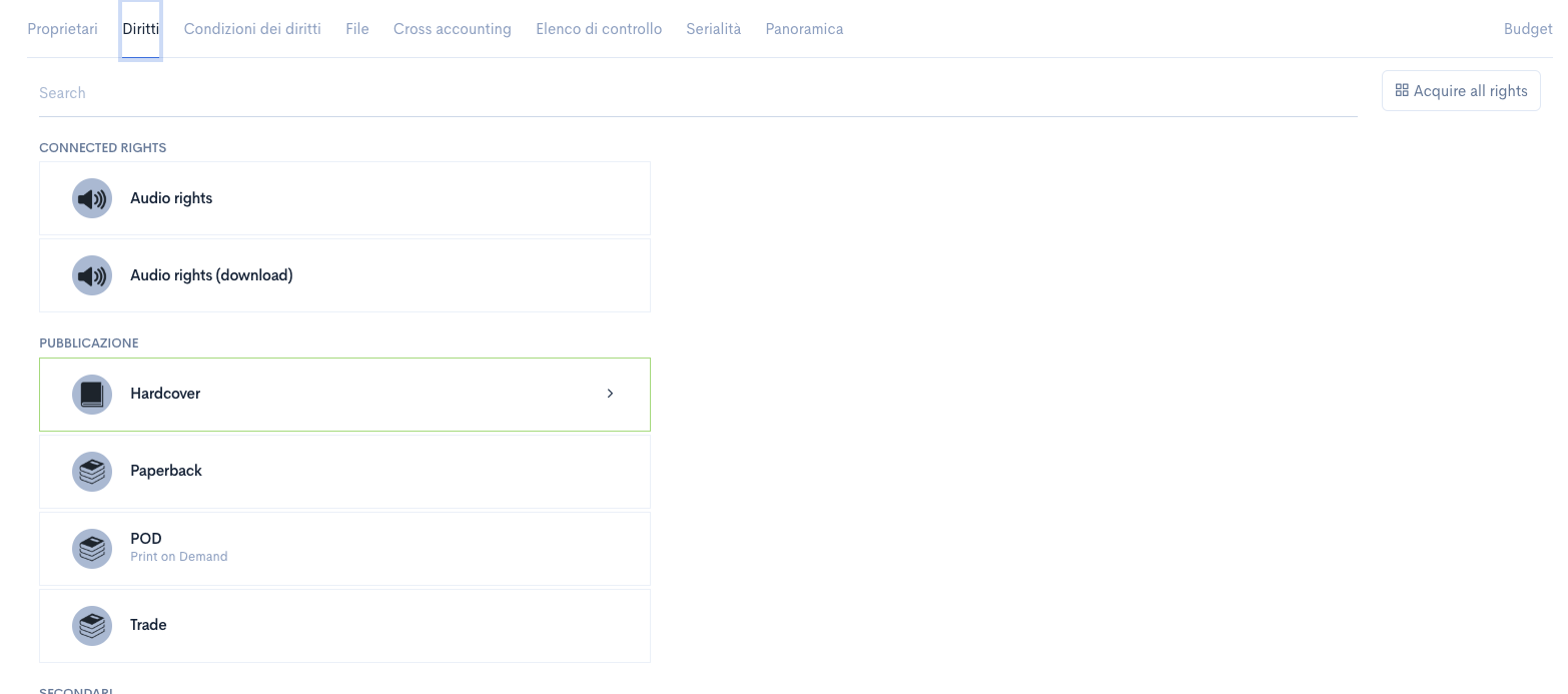 Alcuni diritti sono, di default, associati alla lingua (che significa che puoi definire per quel diritto specifiche Lingue che intendi acquisire, o meno, ad esempio i diritti di traduzione).